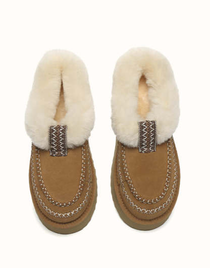 The AUSTRthtALIAN Shepherd Santana Wool Collar Platform Slippers blend cozy warmth with effortless style. Made from plush sheepskin, they offer superior insulation, while the woven design adds a chic touch. Available in classic Chestnut, these slippers feature a premium sheepskin-lined innersole for ultimate comfort and sturdy soles for enhanced grip on slippery surfaces—an essential addition to your wardrobe.