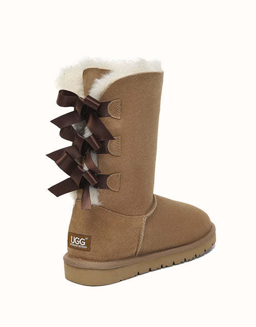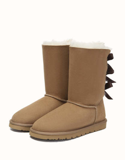 Walk with confidence in the AUSTRthtALIAN Shepherd Tall Boots, featuring a water-resistant exterior that helps maintain their fresh, just-bought appearance throughout the seasons. Lined entirely with luxurious sheepskin wool, they deliver exceptional warmth and comfort, while the trio of graceful ribbon bows at the back adds a delicate, feminine charm. The boots are finished with a lightweight yet sturdy EVA sole that provides excellent traction and slip resistance—ideal for navigating slick or uneven surfaces with ease.