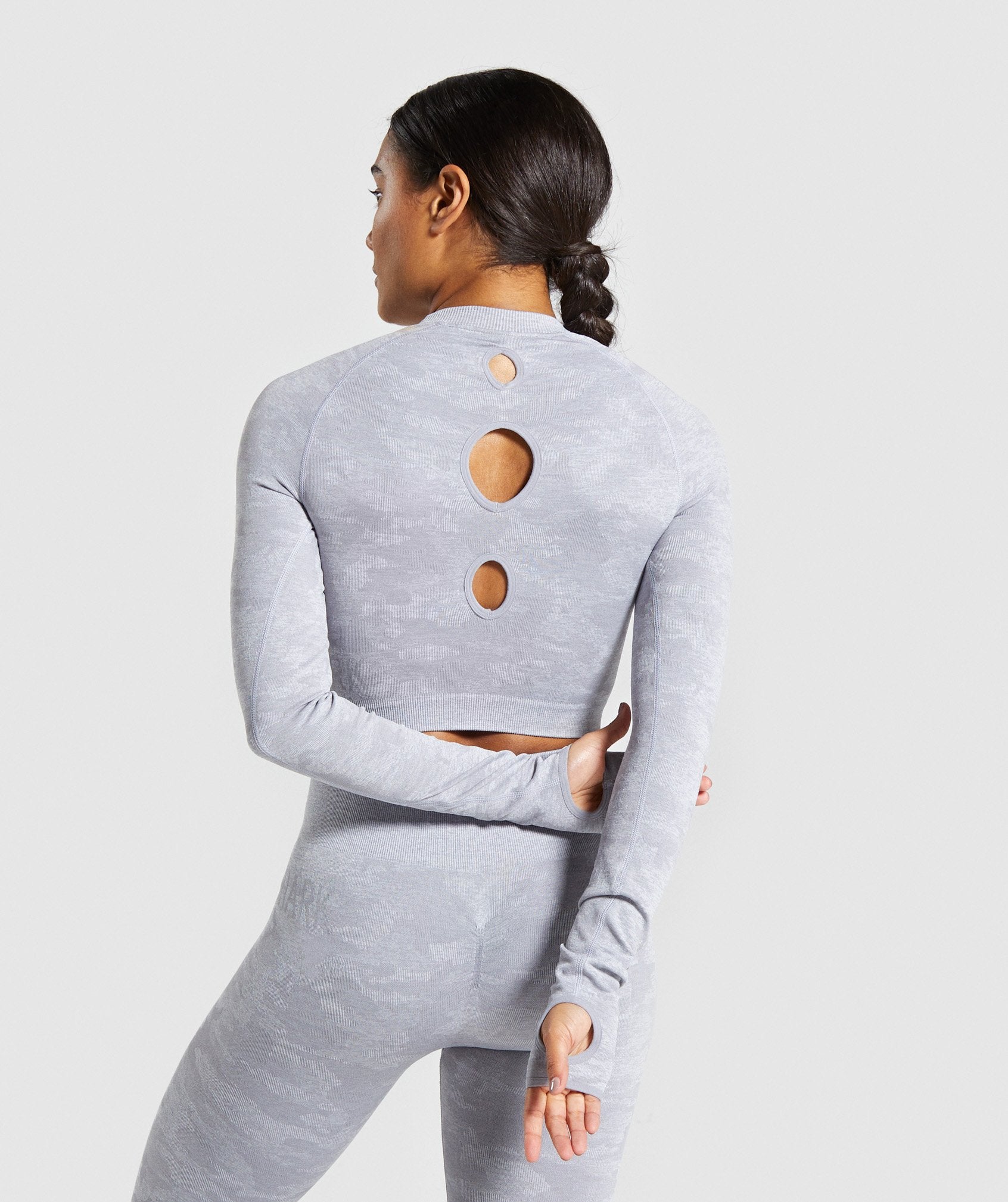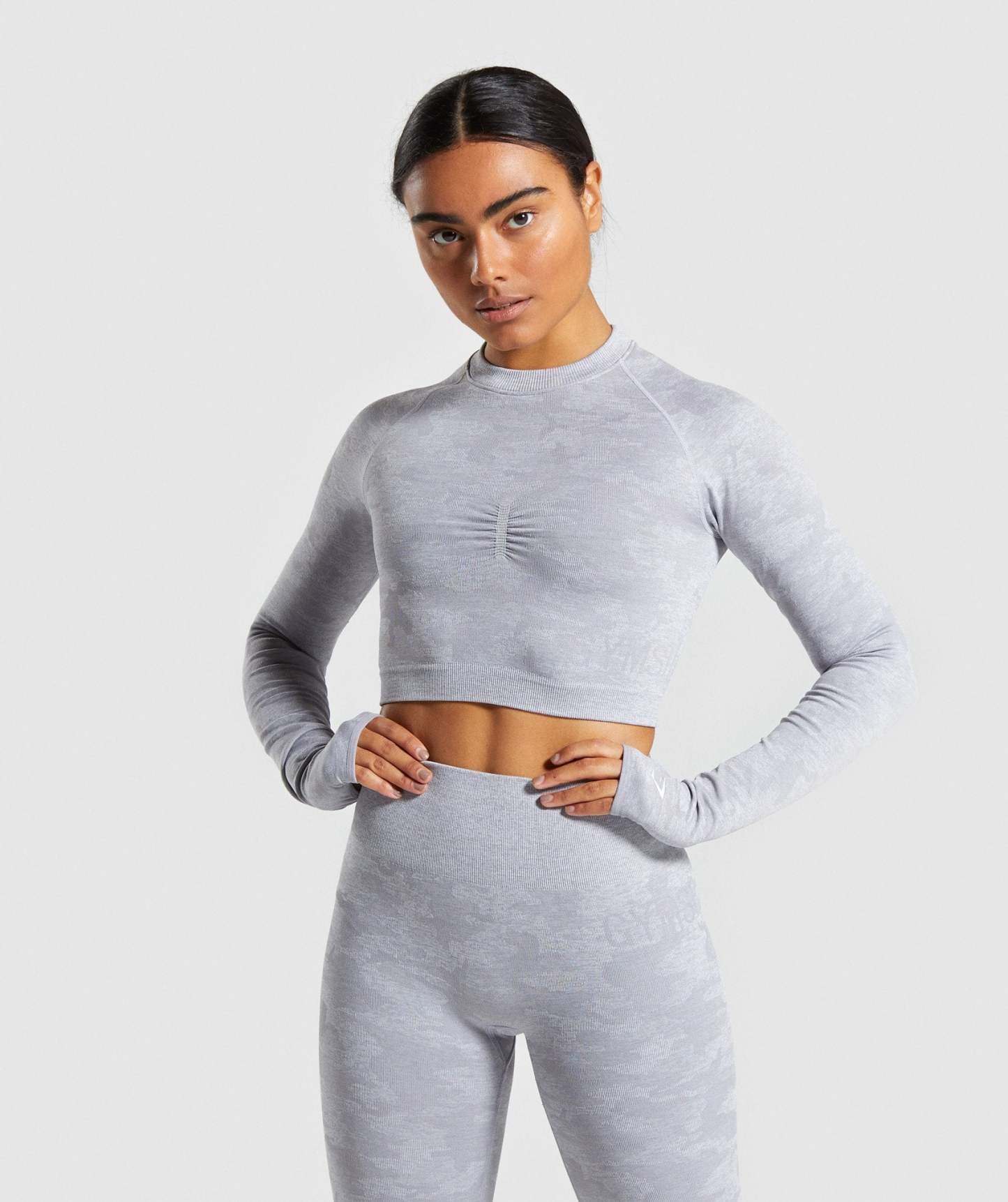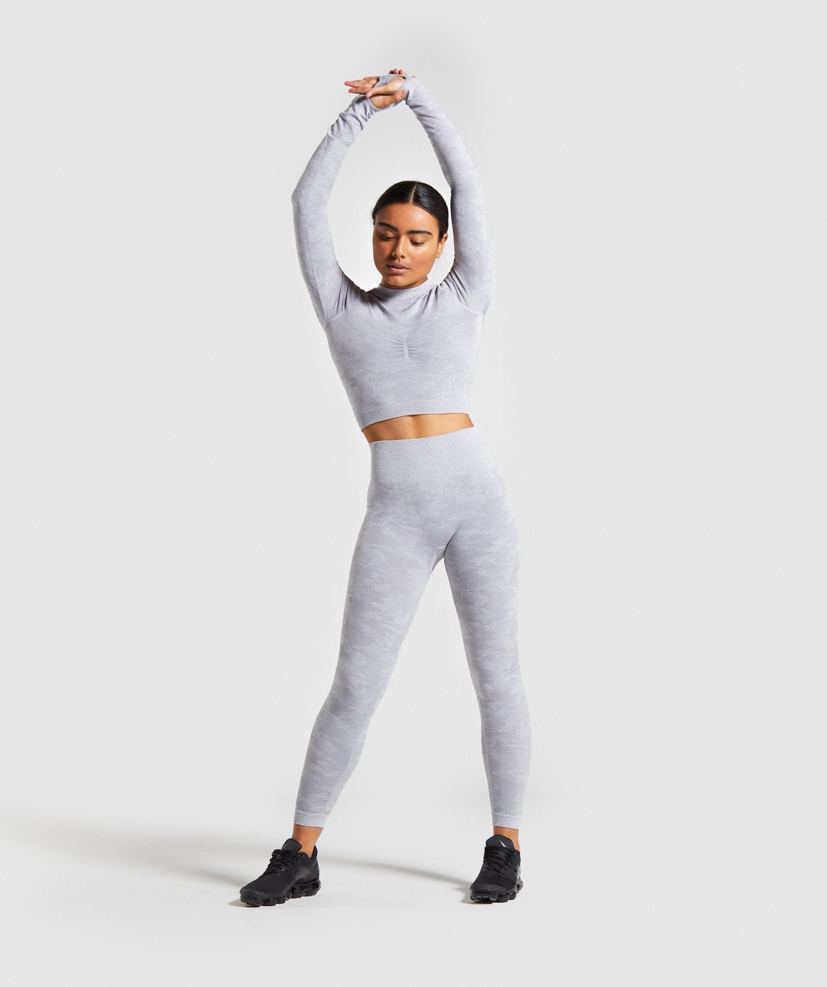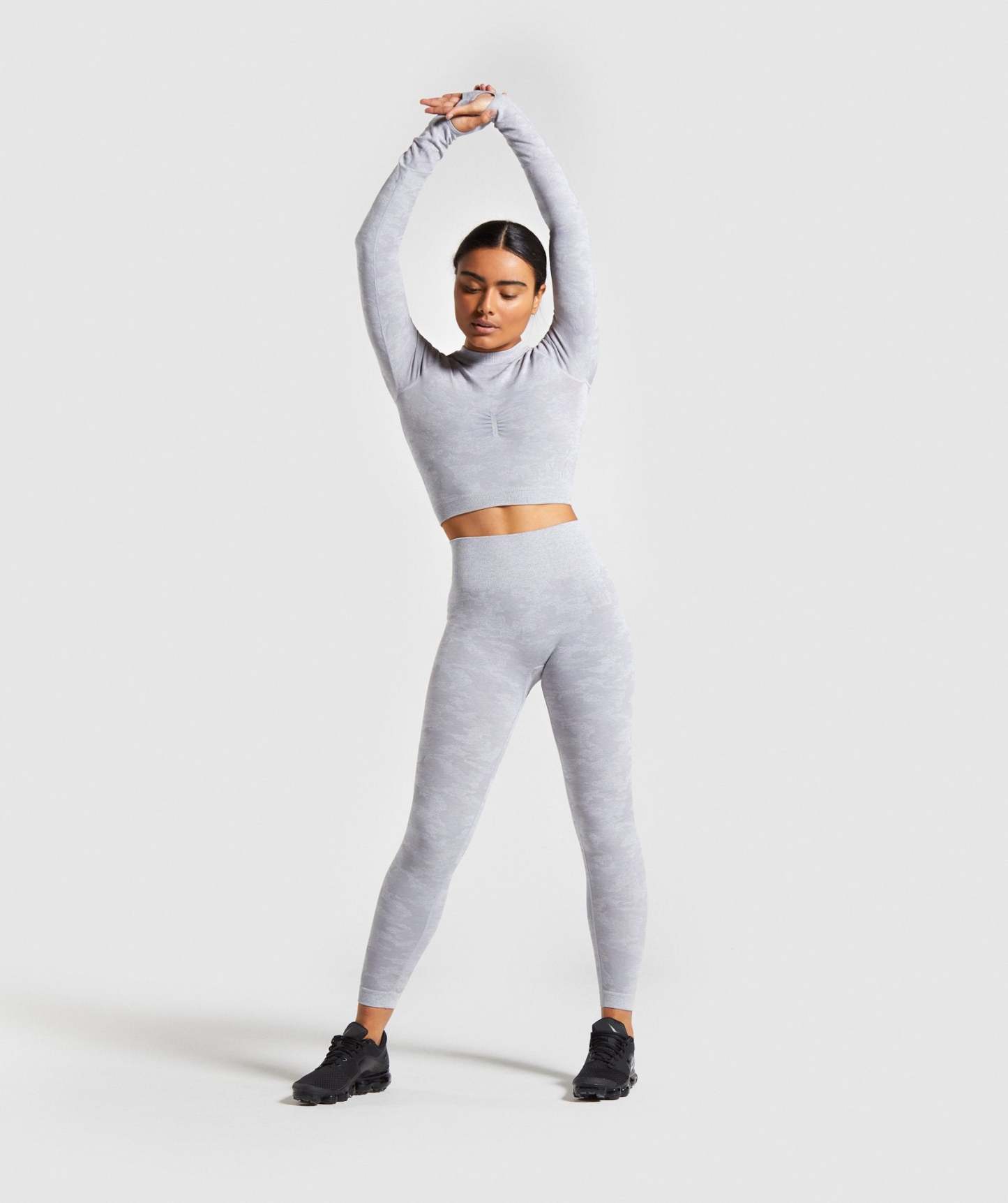 Attention! This midriff crop boasts distinct jacquard camo colourways, ruched chest detailing, and back openings make it flexible, comfortable and ready for even the most intense of workouts. Whatever your mission, the Camo Seamless Long Sleeve Crop Top will see you through in style.