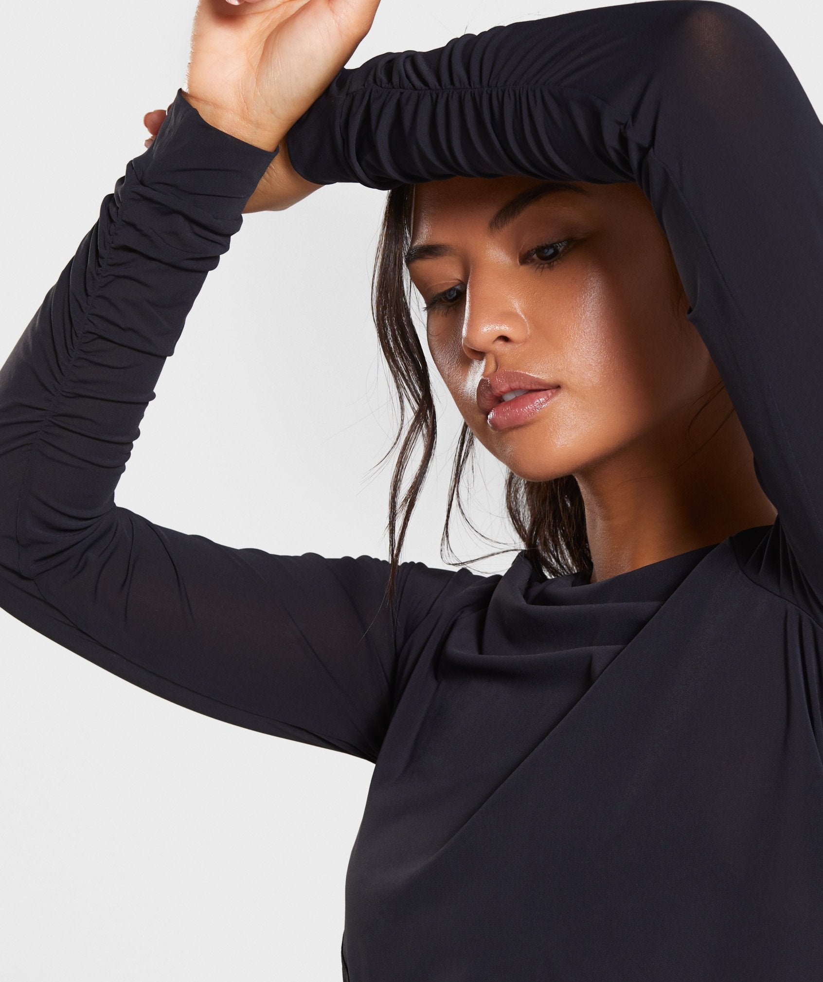 Design focused on breathability and movement, so you can focus on training. The Mesh Layer Long Sleeve Top mixes lightweight mesh materials with a regular fit for function, and a subtle midi-length crop with asymmetric seam lines and ruched details for a flattering form.