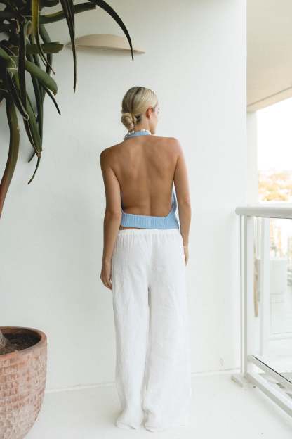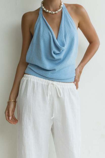Introducing the Dusk Cotton Knit Halter Top - a must-have for any summer wardrobe. This backless top is perfect for a day at the beach or a sunny summer day, making a cool statement and providing ultimate comfort. Made with high-quality cotton, it's the perfect addition to slip over a bikini or pair with your favorite beachy bottoms.