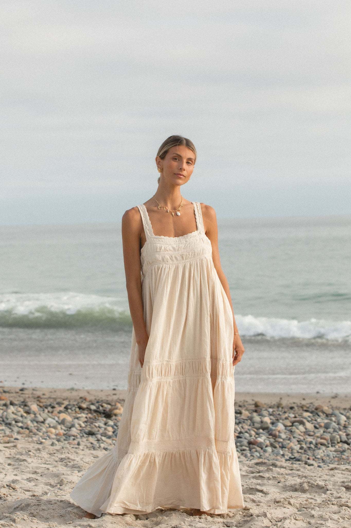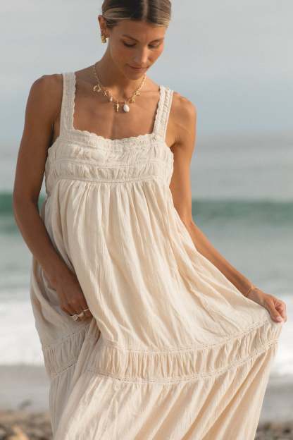 This Salt and Sea Woven Cotton Gauze Dress is designed with a billowy tiered silhouette and delicate lace detailing. Made from lightweight gauze fabric, it offers effortless elegance and comfort.