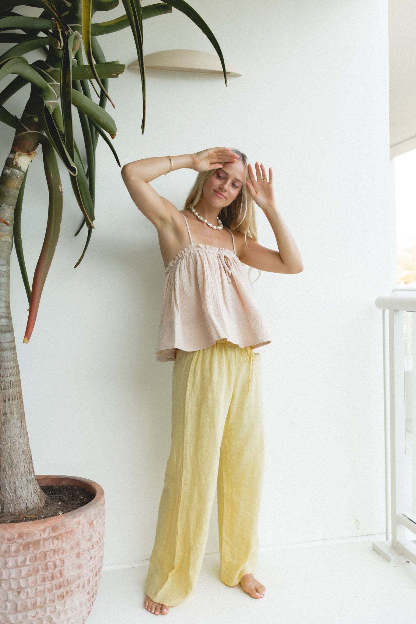 Introducing the Skyline Woven Cami Tank Top, a tiered flowy blouse made from lightweight gauze cotton. Its drawstring tie top detail adds a touch of elegance, making it perfect for any occasion.?