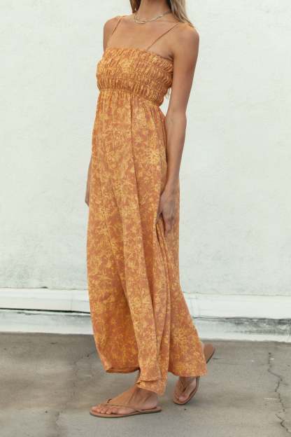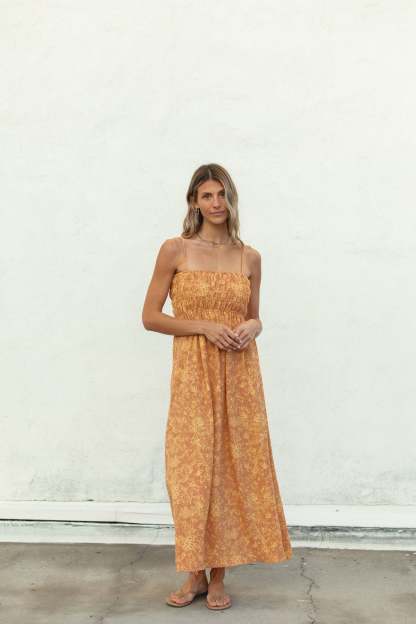 Meet the Sunrise Smocked Spaghetti Dress, which offers a beautiful print detail and a stretchy smocked chest fit. This midi length dress provides both style and comfort - a perfect addition to any wardrobe.