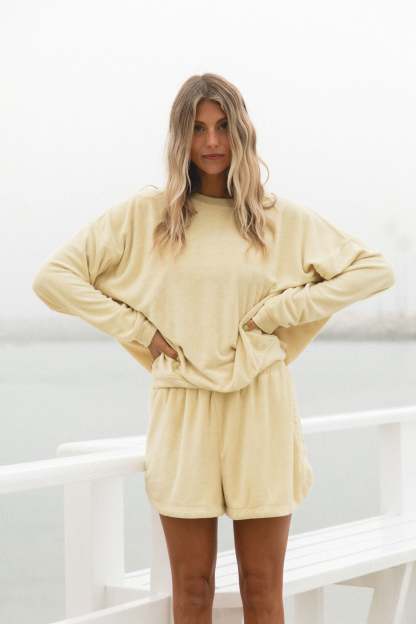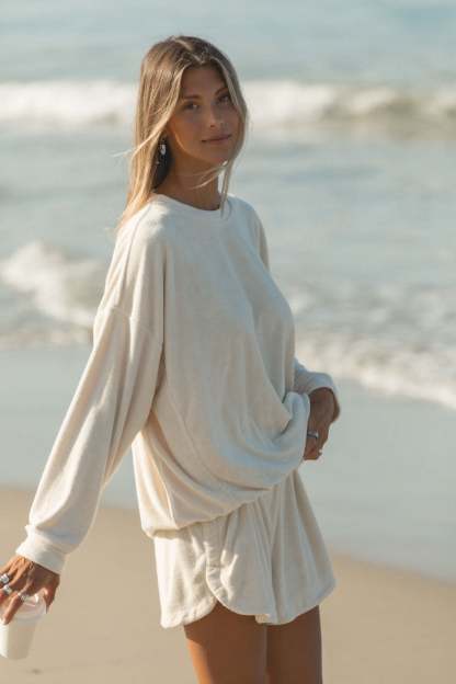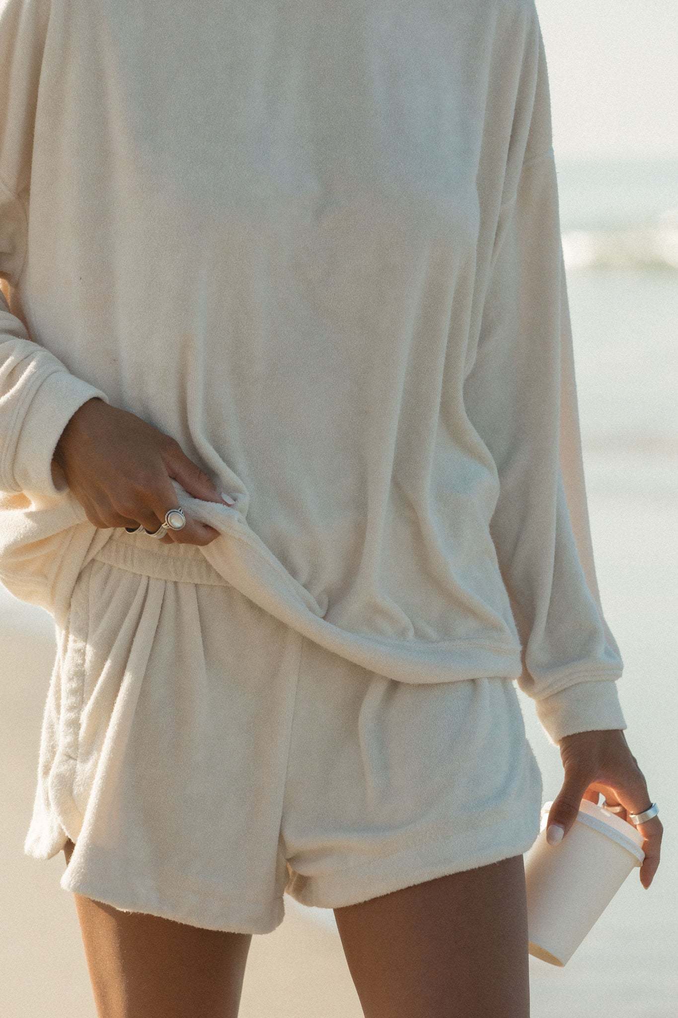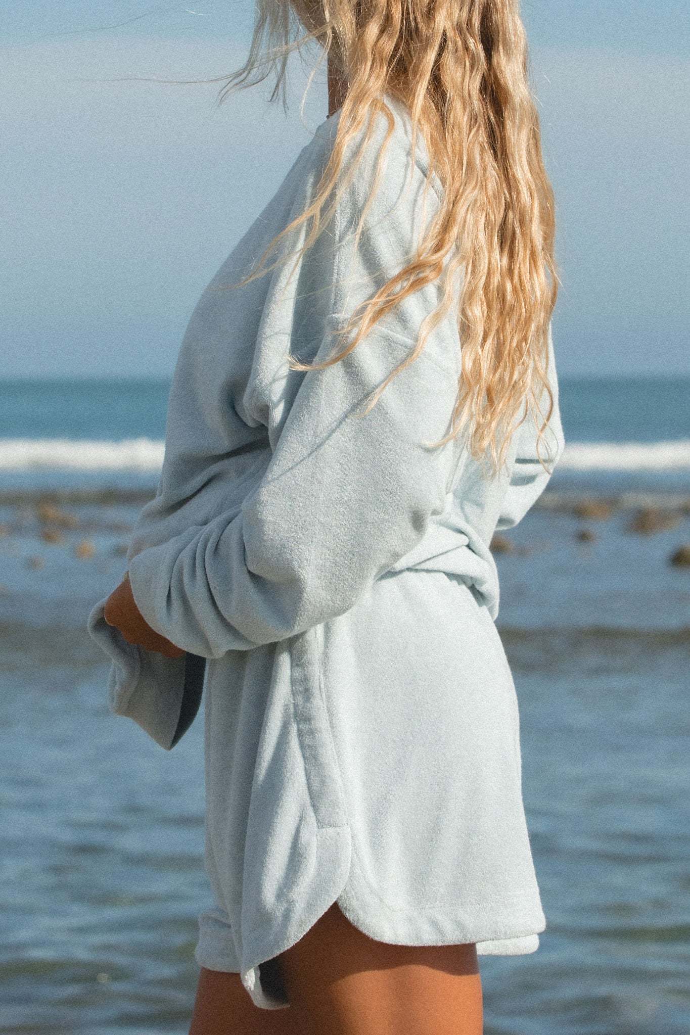 Introducing Surfrider Towel Shorts, the perfect addition to your beach wardrobe. made to be worn after a cool ocean dip, or as a causal everyday look. These versatile shorts can be worn alone or paired with the Surfrider Towel Oversized Pullover for a complete look. With a subtle scoop and side slit, these shorts offer a flattering fit.?