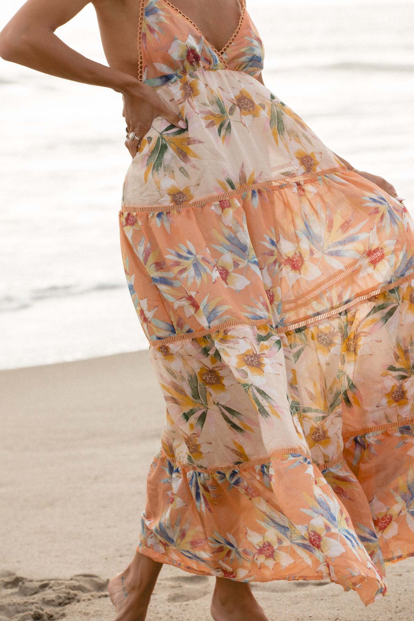 This Tropical Sunrise Printed Maxi Dress features a detailed floral print and stitched detailing on the neckline and throughout. The v-neckline, adjustable straps, and low back add a touch of femininity. Stay breezy and stylish with this tiered dress, perfect for any warm weather occasion.