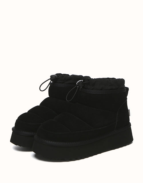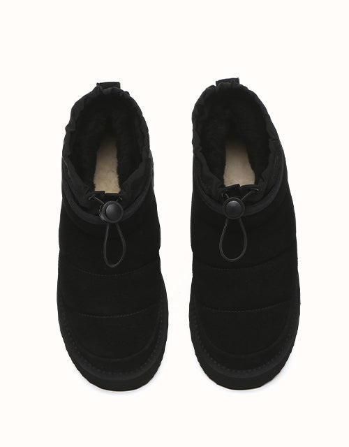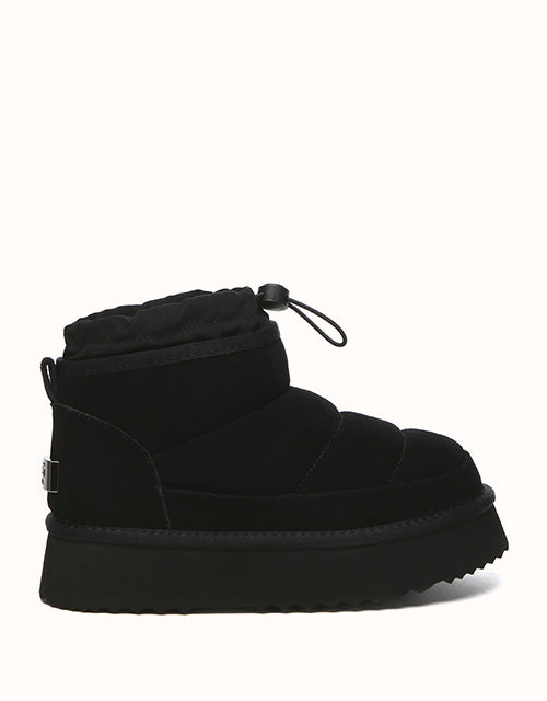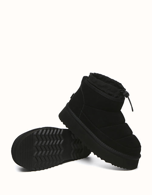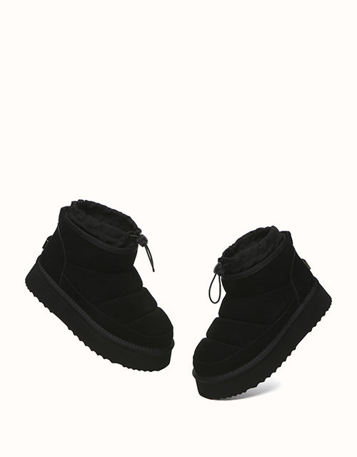 Stay cozy and stylish in the EVEthtRAU Picken Boots. Made from premium water-resistant cow suede, they feature an adjustable drawstring collar for a secure fit and wind protection. Lined with Australian sheepskin wool, they offer breathable warmth and all-day comfort. The chunky platform adds lightweight cushioning and extra height. Available in Chestnut, Black, and Brown UGthtGa versatile choice for everyday wear.