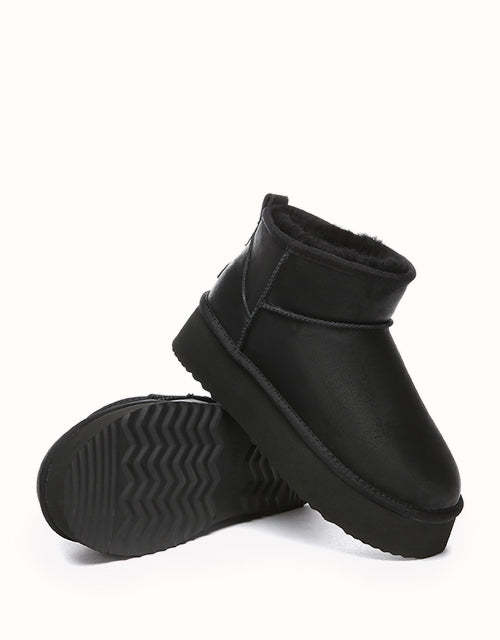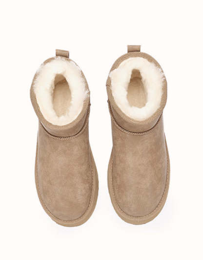 Step into timeless winter style with these chic mini slant-top snow boots, featuring a front-high, back-low silhouette crafted from premium water-resistant suede leather. Designed with breathable and durable Australian craftsmanship, they pair effortlessly with any outfit. Lined with luxurious Merino wool, these boots provide superior warmth, moisture-wicking comfort, and temperature regulation for all-season versatility. The 4cm platform EVA sole offers lightweight elevation, flexible support, and excellent grip, ensuring every step is as comfortable as it is stylish. Perfect for the season, these boots combine functionality and fashion in one iconic design.
