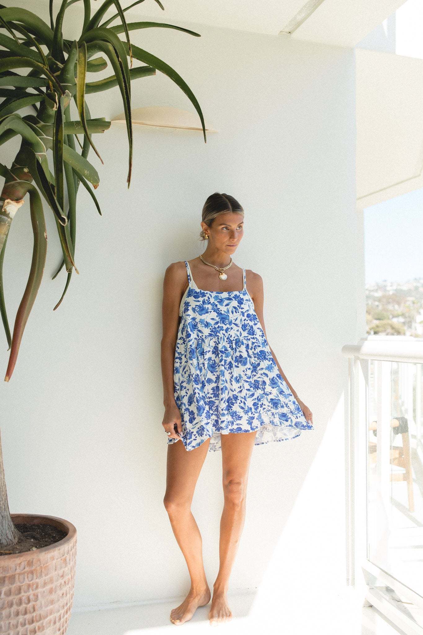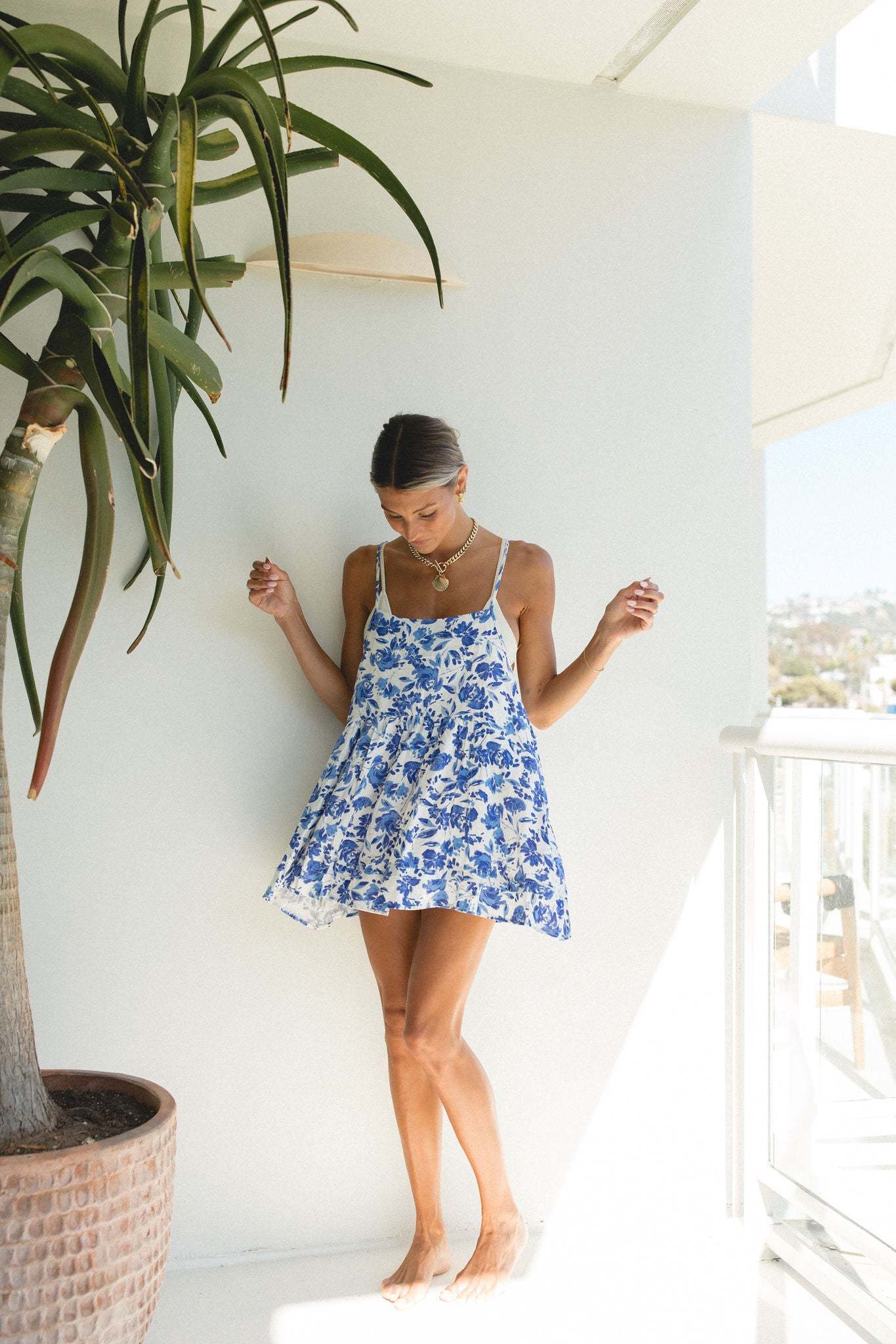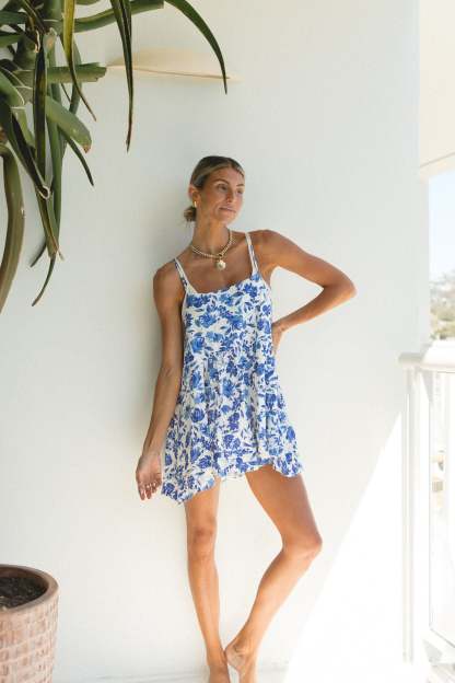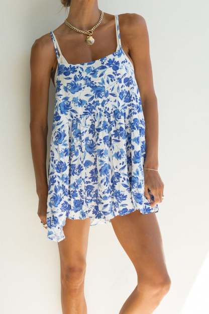 This mini sundress is perfect for your next beach getaway, with a flattering low back design and lightweight fabric that can easily be layered over a bikini or tank top. Its blue floral print adds a touch of coastal chic to your vacation wardrobe.