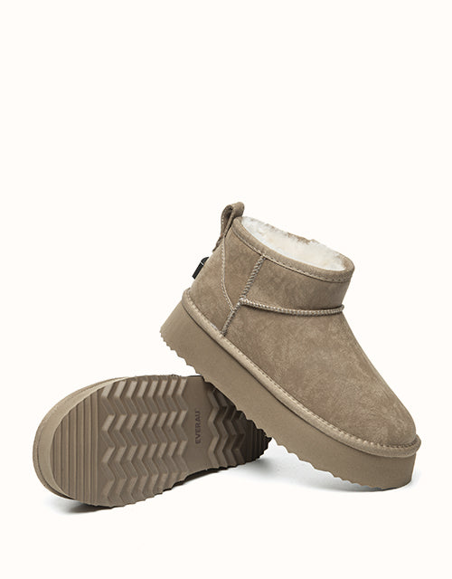 Elevate your style and comfort with the UGthtG EVEthtRAU Romi Ankle Platform Boots. Designed with a trendy platform sole, these boots keep you effortlessly on-trend. Crafted from genuine sheepskin wool, they provide a plush, cloud-like warmth for ultimate coziness. Available in Chestnut, Sand, and Black, their glossy finish adds a touch of refined elegance to any look.